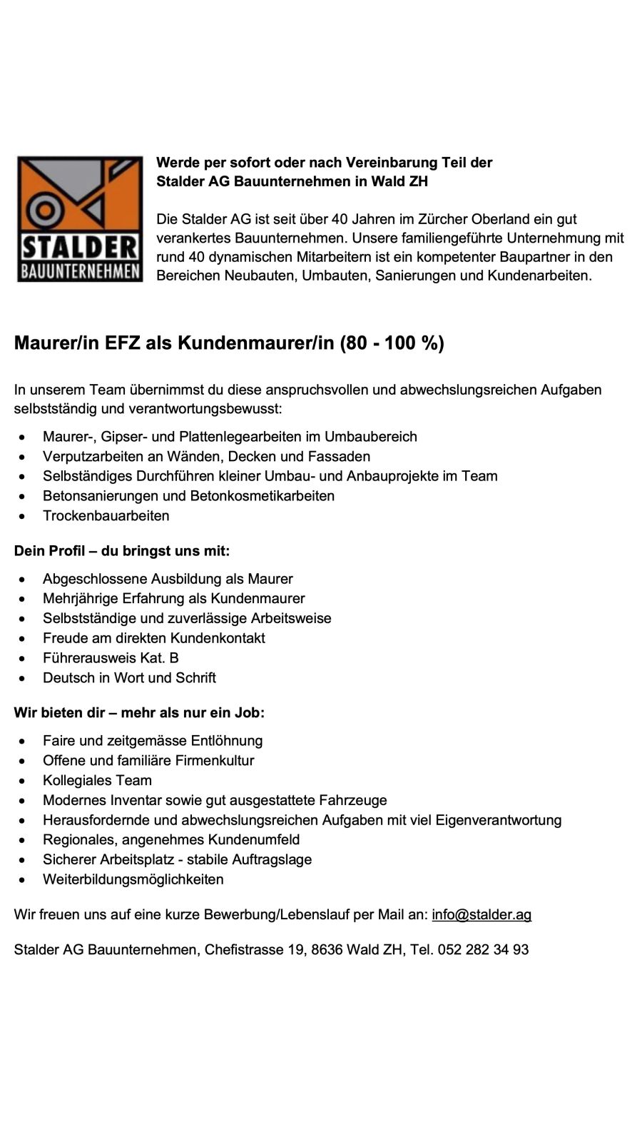 Wir suchen dich - Maurer/in EFZ 80-100% als Kundenmaurer/in